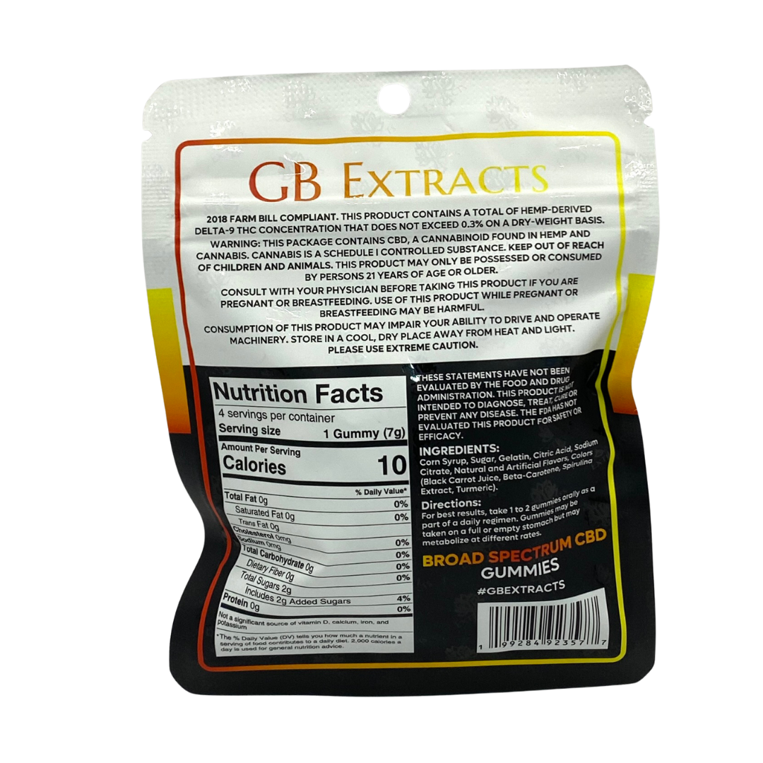 Experience the delightful benefits of CBD with Gb Extracts Broad Spectrum CBD Gummies. Each bag contains 4 flavorful gummies, each packed with over 100mg of high-quality CBD. Available in mouth-watering flavors such as Tropical, Fruit Punch, Cherry, and Apple, our CBD Gummies offer a tasty and convenient way to incorporate CBD into your daily routine.